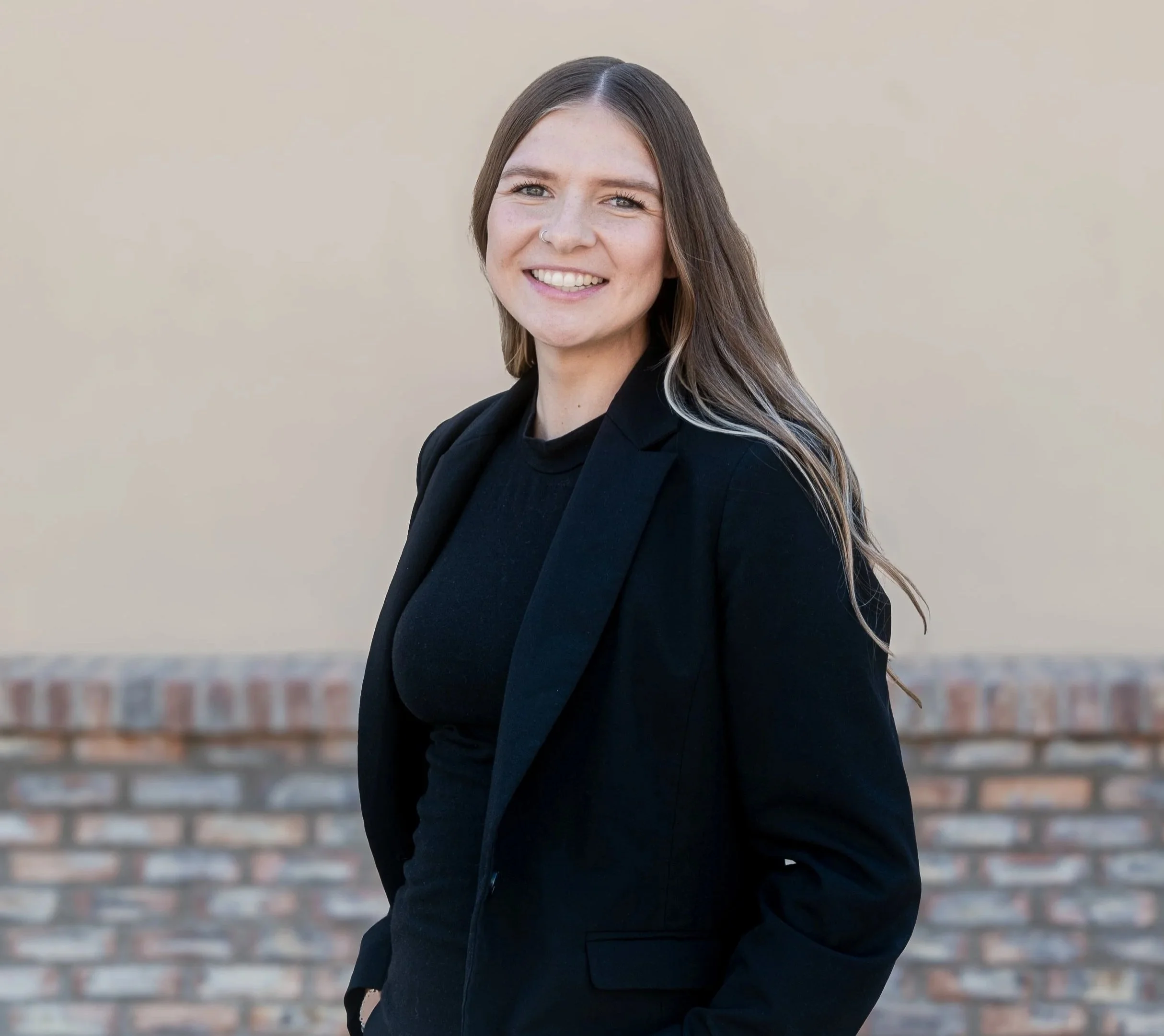 • Smiling woman with long hair and a nose ring, wearing a black outfit, against a beige background.