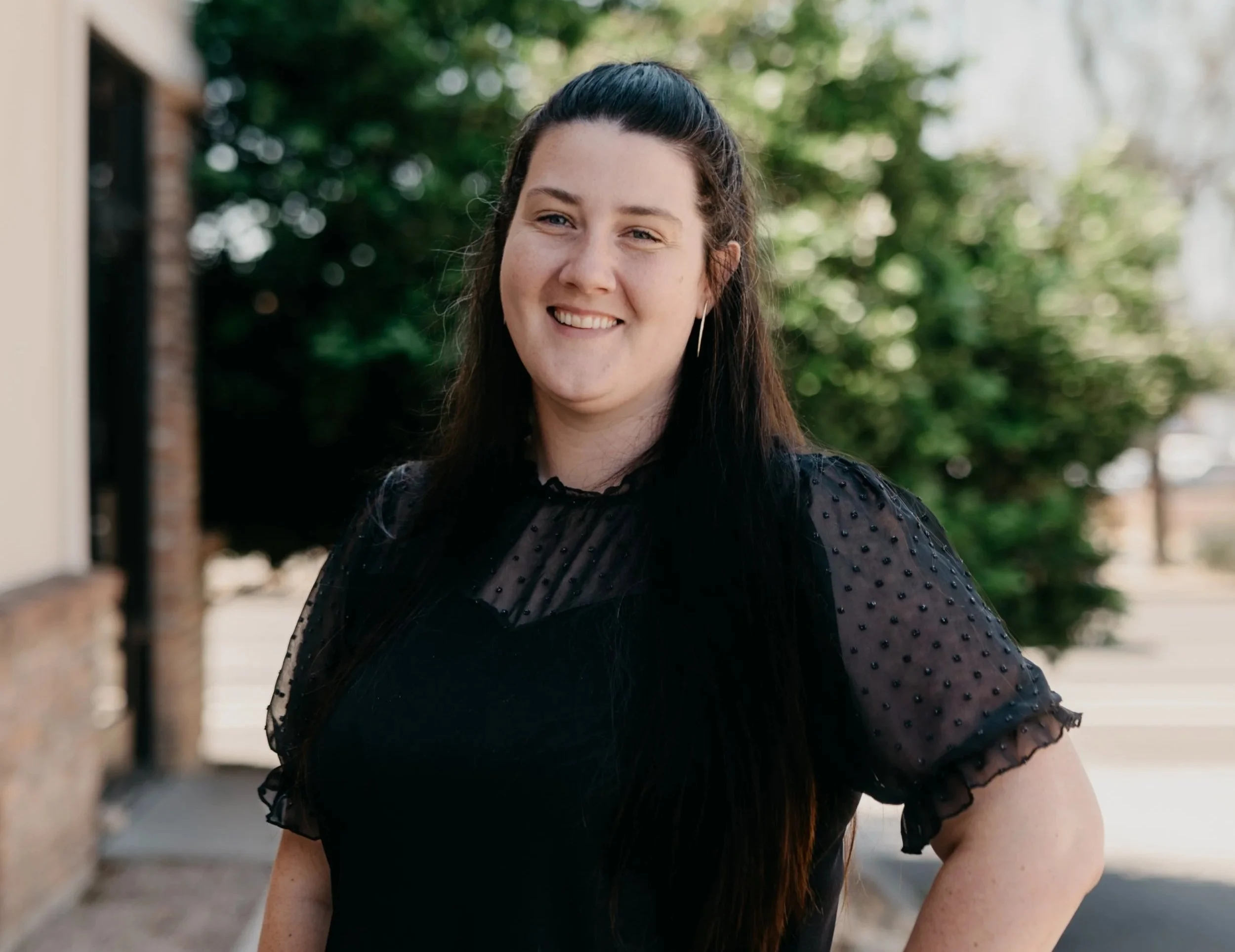 • Smiling person with long brown hair wearing a black shirt against a plain background.